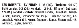 Irnfritz diktierte von Beginn weg, brachte eine Vielzahl an Chancen – darunter ein Stangenschuss – aber nicht im Tor unter. Praktisch mit dem ersten Angriff gingen die Gäste in Führung: Ein harmloser Schuss sprang von der Brust der Schlussfrau ins Tor. Nach einem Konter folgte das 0:2, ehe Birgit Gutmann per Elfer verkürzte. Der zweite Abschnitt spiegelte dem ersten. Irnfritz spielte, aber Furth traf – Endstand: 1:3